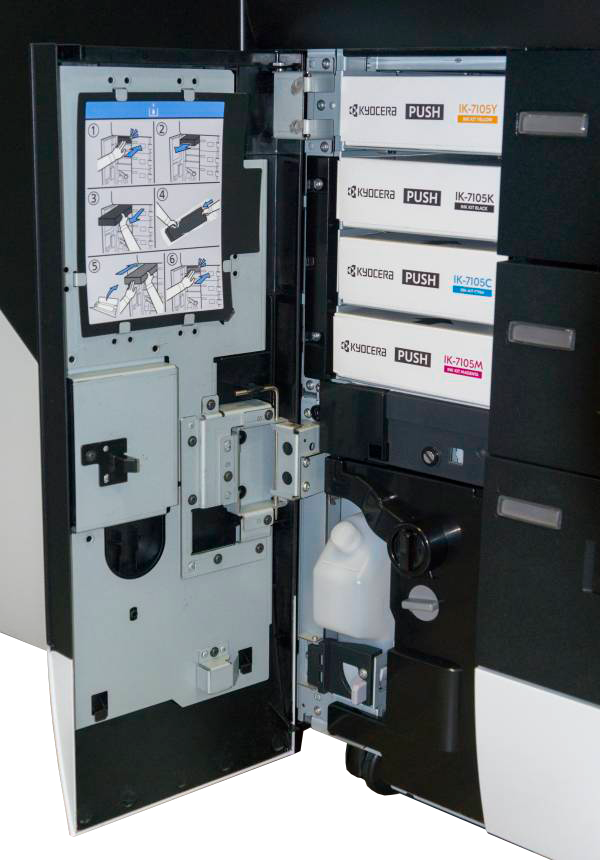 Основным расходным материалом для машины TASKalfa Pro 15000c являются чернила. Они поставляются в раздельных емкостях, рассчитанных на печать 80 тыс. страниц. Кроме того, периодической замене подлежат контейнер для сбора отработанных чернил и емкость с очищающей жидкостью для обслуживания печатающих головок, рассчитанная на печать 600 тыс. страниц.