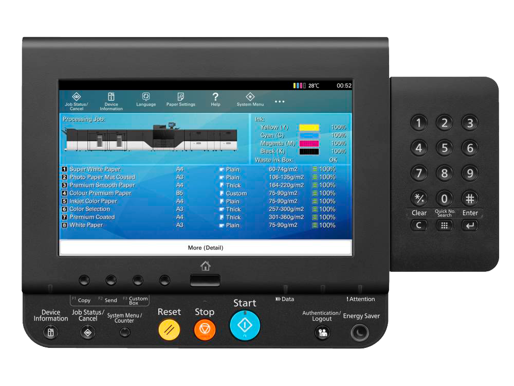 В базовой конфигурации модель TASKalfa Pro 15000c оснащается встроенным блоком управления и обработки изображений KDC RIP. В память машины загружена библиотека готовых профилей для различных носителей, которую можно пополнять по мере необходимости. На основном модуле установлена панель управления с большим цветным сенсорным экраном и блоком цифровой клавиатуры.