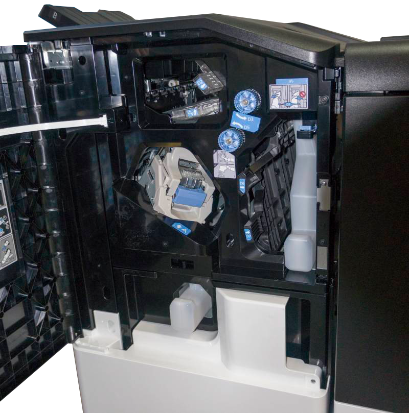 Машину можно укомплектовать одним или двумя модулями стекера емкостью по 5000 листов каждый с выкатывающейся тележкой и верхним выходным лотком, а также финишером на 4000 листов с автоматическим степлером (стопки до 100 листов) и дыроколом на 2 или 4 отверстия. В модуле финишера можно установить устройство для фальцовки и автоматического изготовления буклетов (до 20 листов).