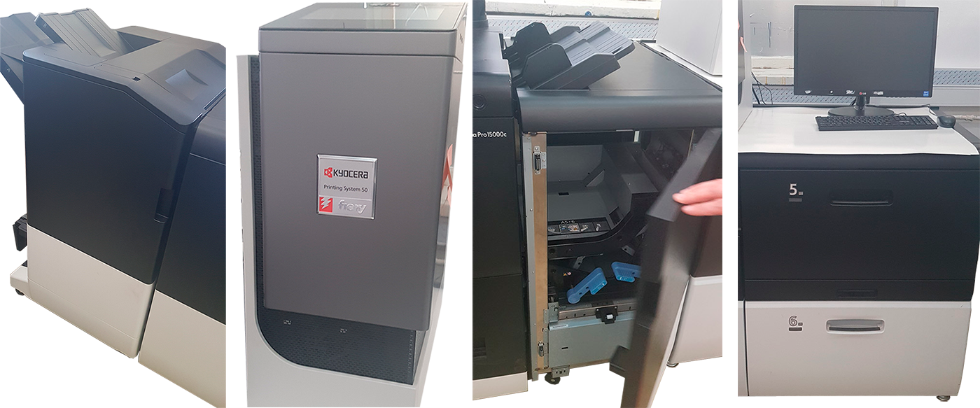 Таким образом, в типографии tprint появилась ЦПМ Kyocera TASKalfa Pro 15000c в конфигурации с одним модулем вакуумных подающих лотков большой емкости, финишером и внешним блоком процессора RIP Fiery. Напомним, что в ЦПМ Kyocera TASKalfa Pro 15000c используется пьезоэлектрическая струйная технология печати, благодаря чему данная модель обладает высокой производительностью и эффективностью, а также низким уровнем энергопотребления, что подтверждается многими сертификатами (Energy Star, EPEAT, RoHS и EcoMark). Модульная конструкция позволяет максимально гибко конфигурировать устройство, добавляя лотки подачи носителей (вплоть до 14 310 листов), модули финишной обработки и другие элементы, для того, чтобы достичь наиболее полного соответствия специфике выполняемых работ. ЦПМ способна печатать с разрешением 600х1200 dpi на листовых носителях формата от А6 до SRA3 включительно. Допустимая плотность материалов — от 45 до 350 г/м2.